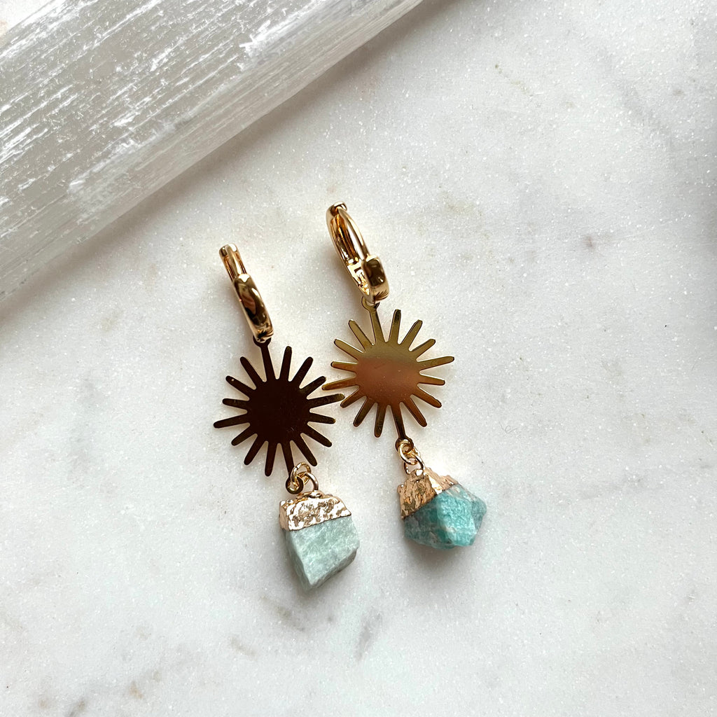 Indulge in the serene beauty of our Amazonite Gemstone Earrings, adorned with 14k gold-filled huggies. Amazonite, often hailed as the Stone of Courage and Truth, graces these earrings with its calming and balancing energy. Embrace the spiritual and mental benefits as you wear this exquisite gemstone, believed to soothe the spirit and calm the mind. Amazonite is said to enhance communication, encouraging authenticity and self-expression. By adorning yourself with these earrings, you not only elevate your style but invite a sense of tranquility and harmony into your life. Step into each day with confidence, grace, and a touch of the spiritual richness that Amazonite imparts. Embrace the beauty that goes beyond aesthetics and radiate the positive energy that these earrings bring into your aura.