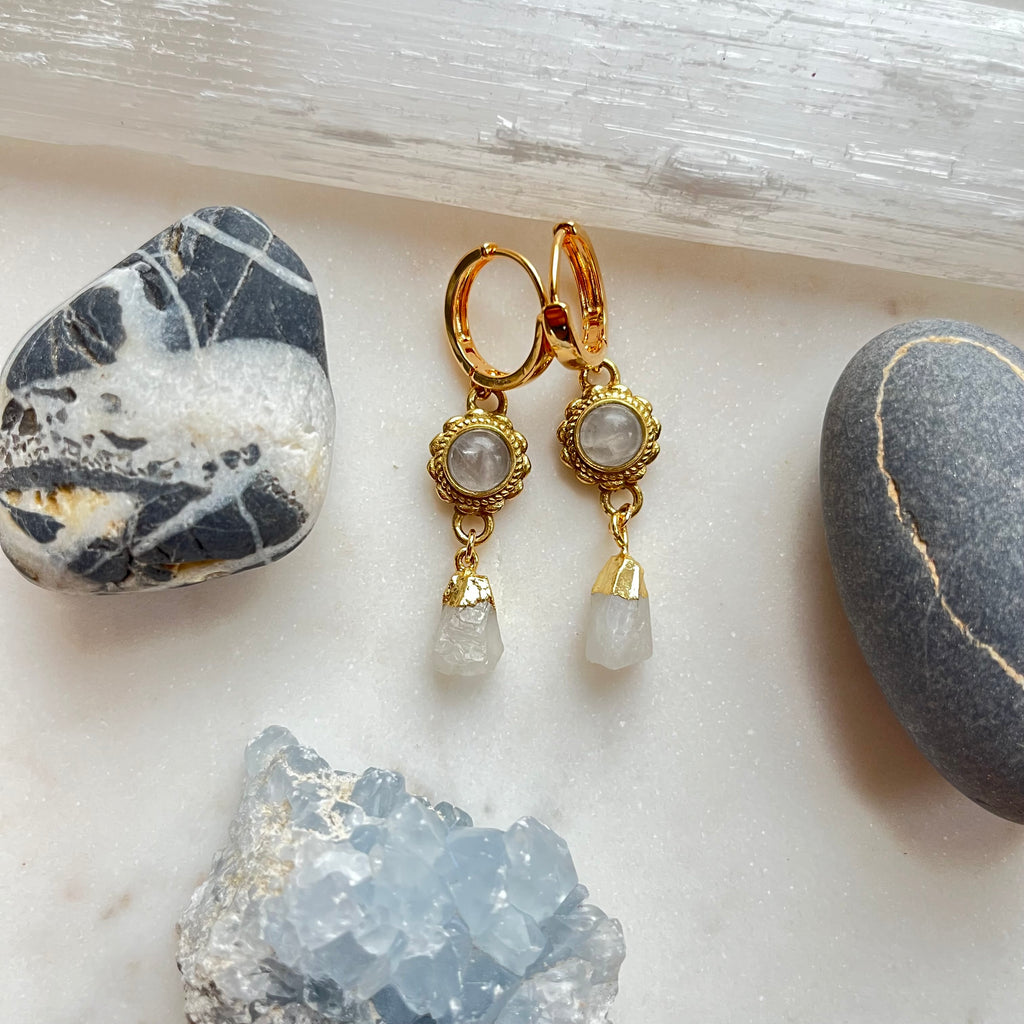 Illuminate your aura with our Moonstone Gemstone Earrings, gracefully nestled in 14k gold-filled huggies. Beyond their enchanting aesthetic, these earrings carry the ethereal energy of Moonstone, a stone revered for its spiritual and mental benefits. Moonstone is believed to enhance intuition, promote emotional balance, and bring about a sense of inner calm. Wearing these earrings is not just an adornment; it's an invitation to embrace the mystical and soothing vibrations of Moonstone in your daily life. Elevate your style while experiencing the harmonious connection between elegance and spiritual well-being. Let our Moonstone Gemstone Earrings be a radiant reminder of intuition, emotional harmony, and the luminous beauty within you.