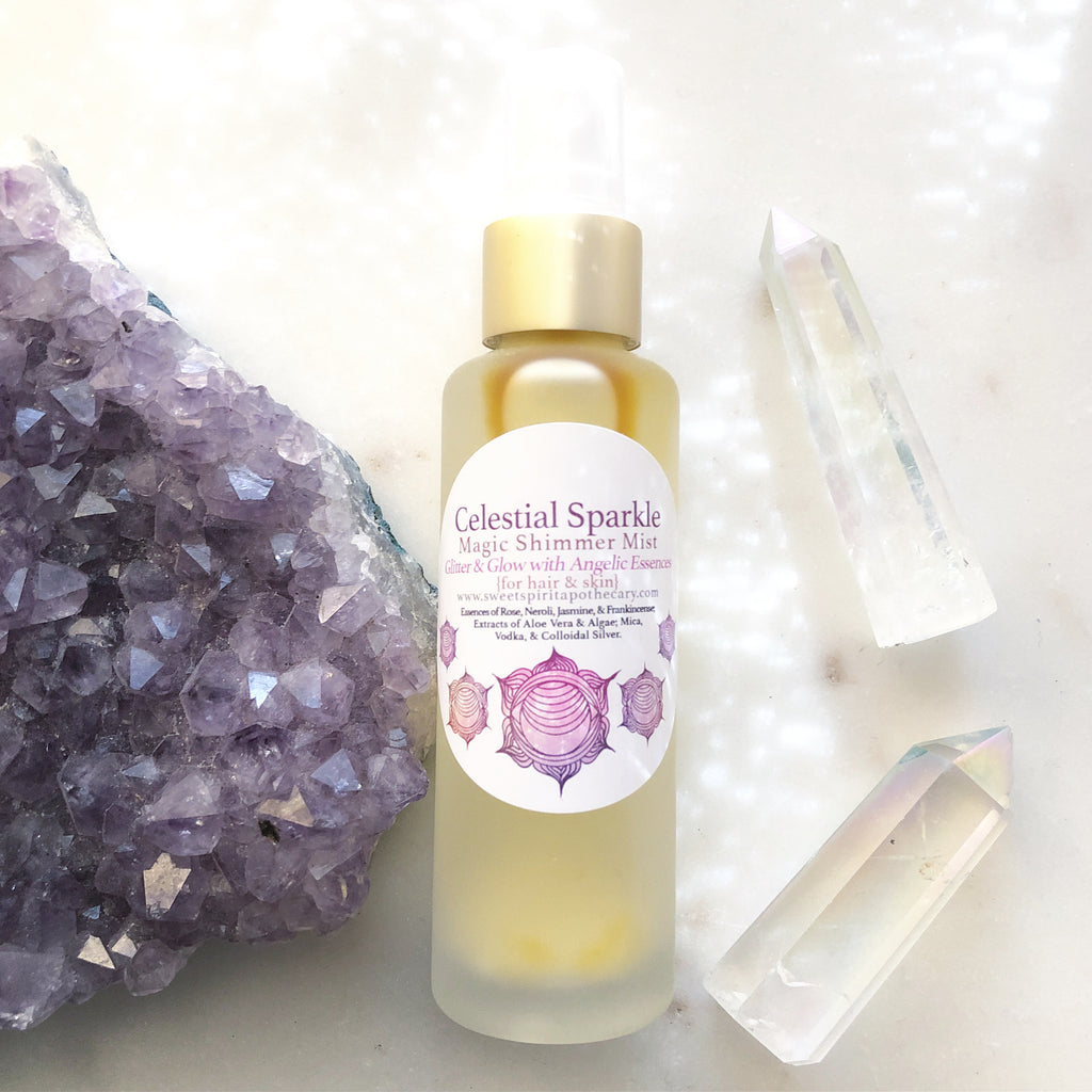 Celestial Sparkle~ Magic Shimmer Mist~ with Angelic essences of Neroli, Jasmine, rose, and frankincense,... swirled with MINT for a dose of fresh air among the celestial blossoms!