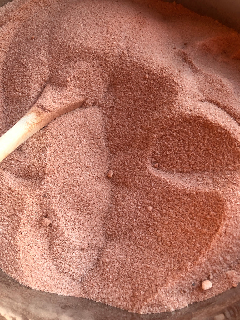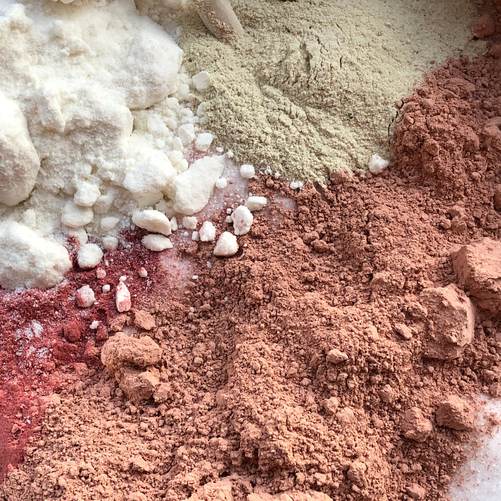 This body polish contains Dead Sea salt, tightening frankincense resin, cleansing French pink clay, brightening Rosehip, hydrating coconut milk powder, oils of babassou and coconut and butters of cacao and Shea.
