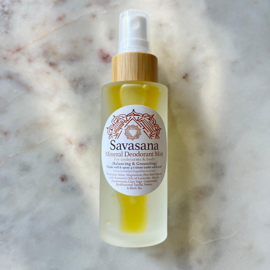 Stay fresh all day with Savasana, a natural deodorant mist made with mineral salts, magnesium, and plant extracts that neutralize odor without blocking your pores.
