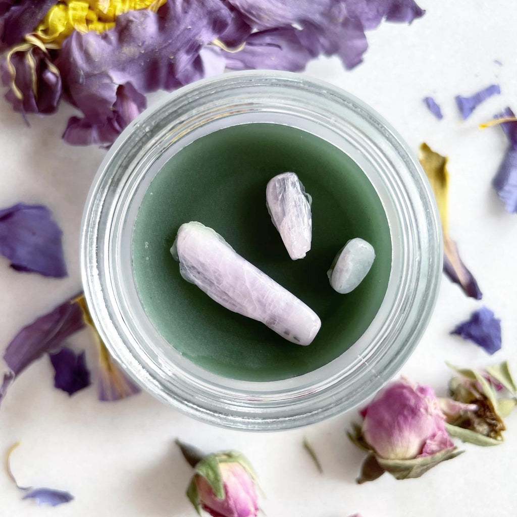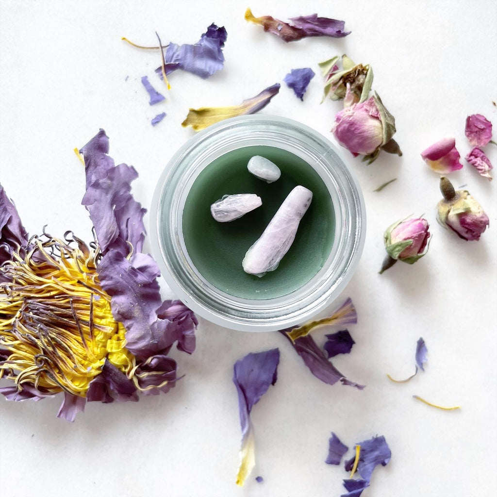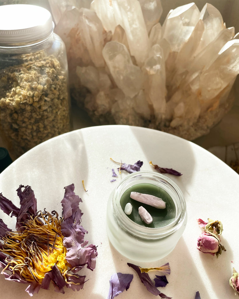 Additionally, these base oils are infused with dried herbs and flowers for several moons. These plant friends lend their harmonious properties to the skin: Irish moss seaweed plumps and hydrates skin,  Hibisicus renews skin cells, Gotu Kola promotes collagen production and cell renewal, and Horsetail strengthens skin.