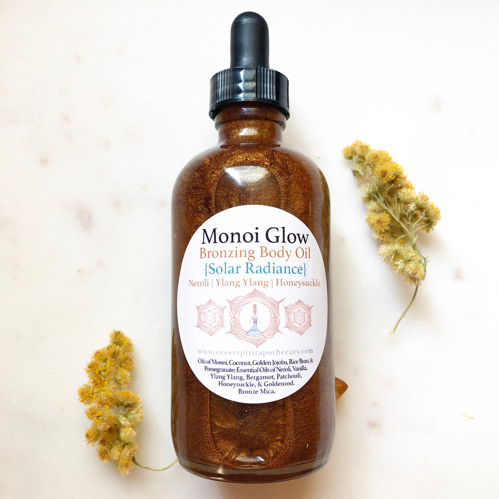 Monoi Glow-Bronzing Oil! Extend your tan into the fall with this super amazing body oil. The bronzing shimmer is totally optional! Shake it up for the bronze, or let it sink to the bottom if you’d rather not be bronze 😘... Oils of Monoi, Neroli, Patchouli, Vanilla, Lavender, Goldenrod, Bergamot, and Honeysuckle, nourish the skin transport the spirit to the tropics! 💗✨💗