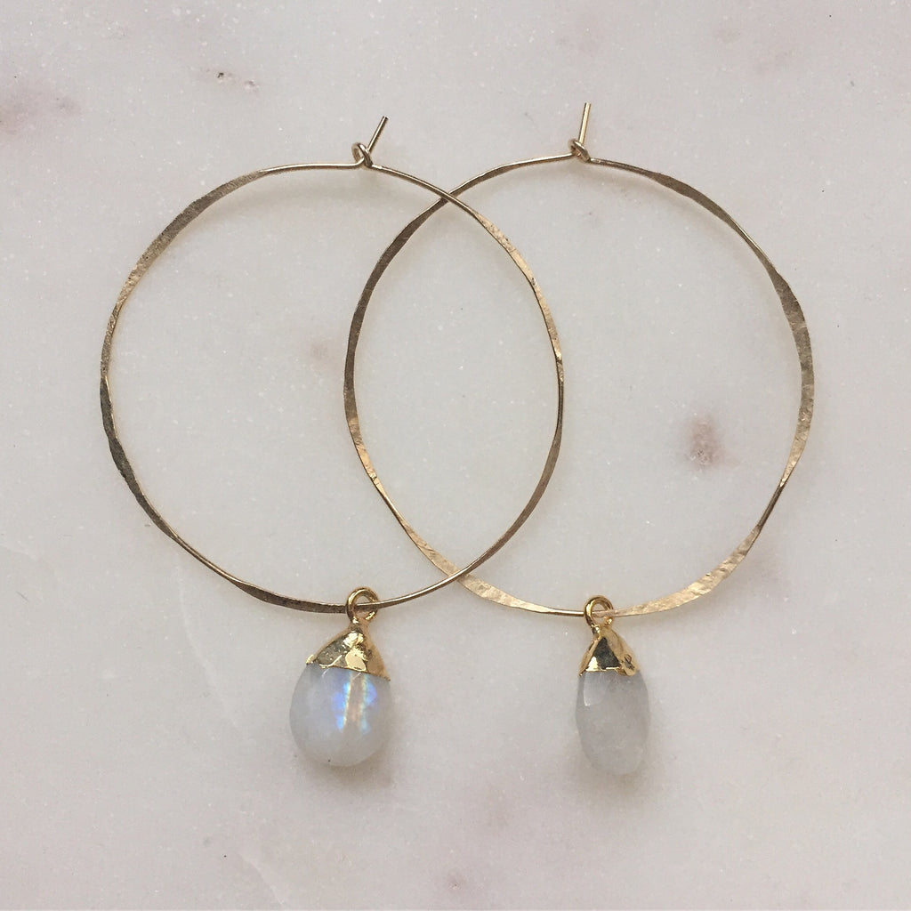 Hand shaped and hammered 14k gold filled hoops with gorgeous faceted Moonstone Drops! Won’t tarnish and safe for sensitive ears...