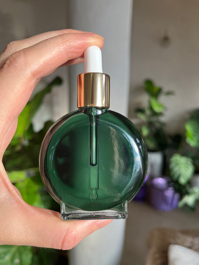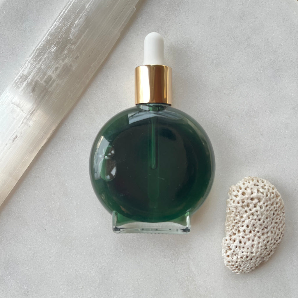 Green Cavair Oil~ (which is actually from seaweed!)  This wondrous marine botanical comes brimming with a host of beneficial constituents, suitable for both hair and skin application. It is rich in minerals such as iodine, phosphorus, zinc, potassium, magnesium, copper and calcium, as well as vitamins such as A , E, and K – which, taken together, remineralize skin and hair, contribute to the maintenance and production of collagen, and reduce capillary fragility that attends puffy under-eye dark circles, respectively. As an oil-rich marine organism, green caviar is a generous source of vegan-friendly omega-3 fatty acids, which are strongly anti-inflammatory and moisture-locking, acting as superb protectors of cell membranes and therefore skin integrity and elasticity. A synergistic complex of bioactive fatty acids and esters contained in the oily fraction of green caviar have demonstrated strong anti-tumor, anti-inflammatory, antioxidant, and antibacterial properties, thus kind to sensitive, delicate and acne-prone skin.