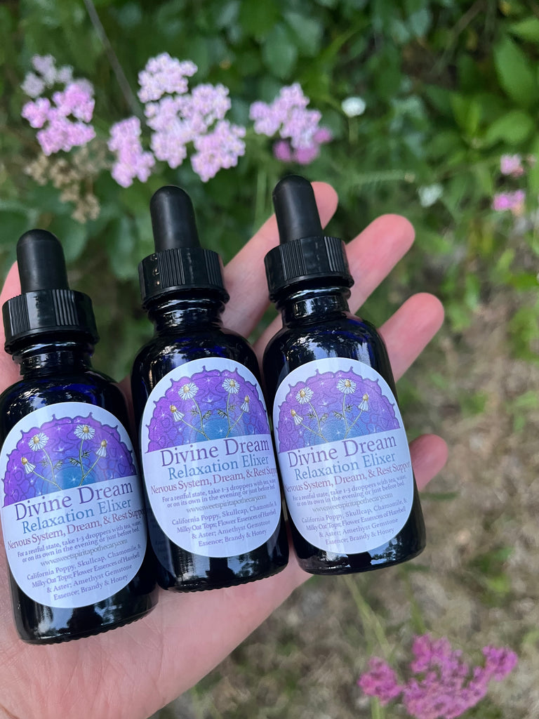 Crafted as a sacred companion for sleep, stillness, and deep emotional restoration, Divine Dream is a calming herbal elixir that softens the edges of the day and invites your entire being into a state of peaceful surrender. It’s a lullaby in a bottle — infused with nervous system–loving herbs, sweetened with raw honey, and woven with the subtle frequencies of flower and gemstone essences that open you to the dreamworld and the divine.