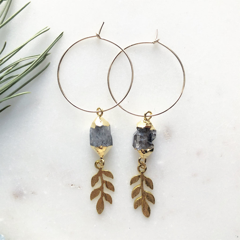 Raw Herkimer Diamond and brass Laurel leaf on 14k gold filled hoops~ getting kissed and infused by a radiant sunset and a rainbow sundog...